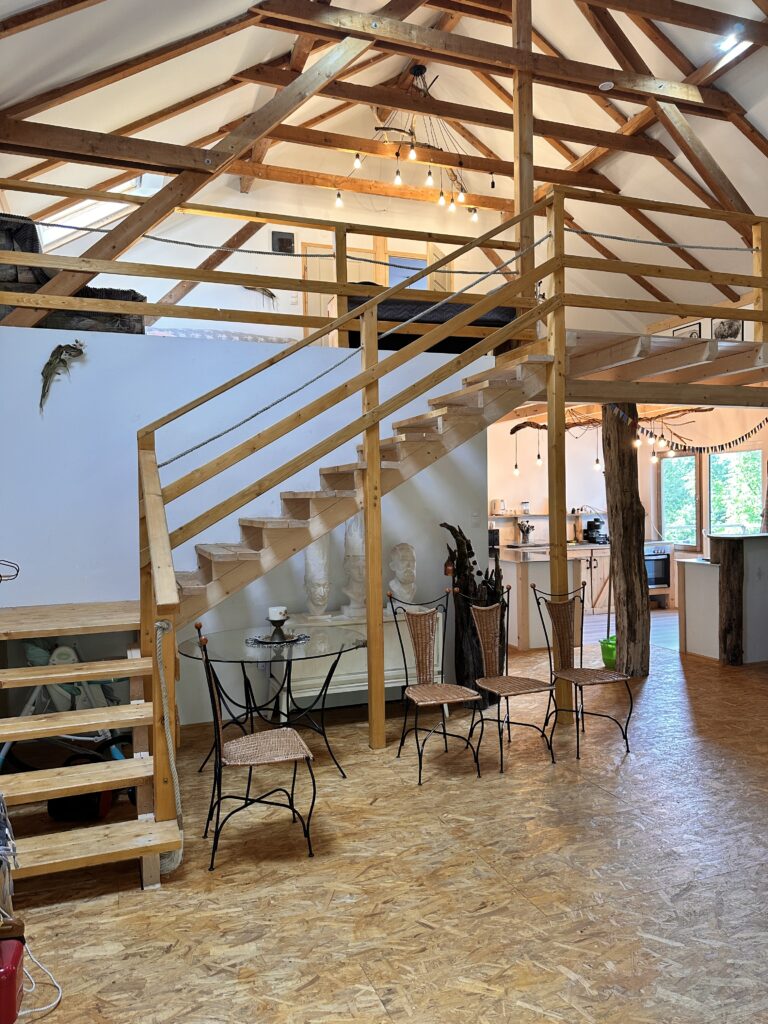 A rusztikus fagerendák, a nagy közösségi terek és a nyitott konyha mind a feltöltődést és az inspirációt szolgálják.