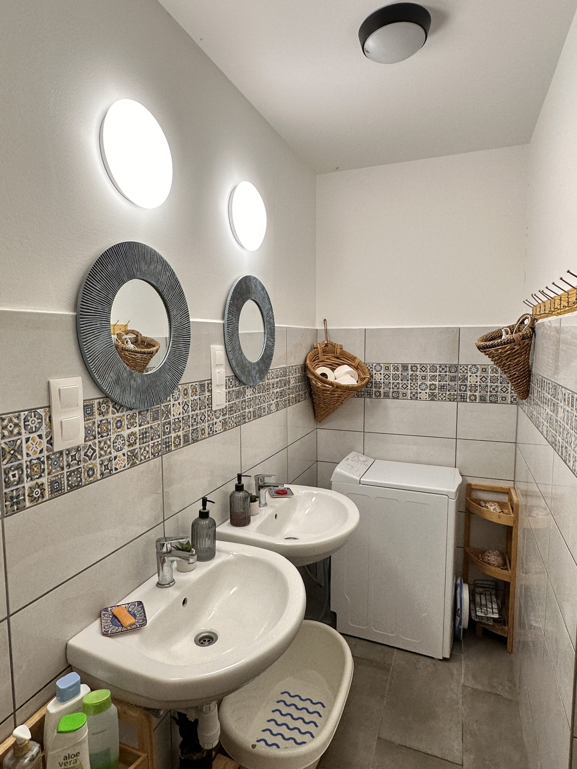 A vendégház fürdőszobája egyszerre praktikus és természetközeli: letisztult formák, fa részletek és természetes fény jellemzi. A zuhanyzót tágas tér, meleg színek és igényes burkolatok teszik otthonossá – akár egy hosszú túra, akár egy kreatív nap után itt igazán megpihenhetsz.